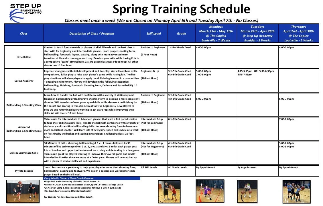 Step Up Basketball Academy will help you improve your offensive and defensive skills with the hopes of allowing you to reach your full potential as a basketball player. Our programs are customized for each individual, class or team that we are coaching. We are experts at teaching basketball fundamentals to beginning, intermediate and elite level players. Our main goal is to teach players the skills they need to ‘Step Up’ their game on and off the court. We offer a variety of skills training options for players of all skill levels. Step Up Basketball Academy is dedicated to help you achieve your goals. We offer classes & programs from mid-August to May each school year and camps in the summer. If you need help determining where to start with your player, please send us an email!